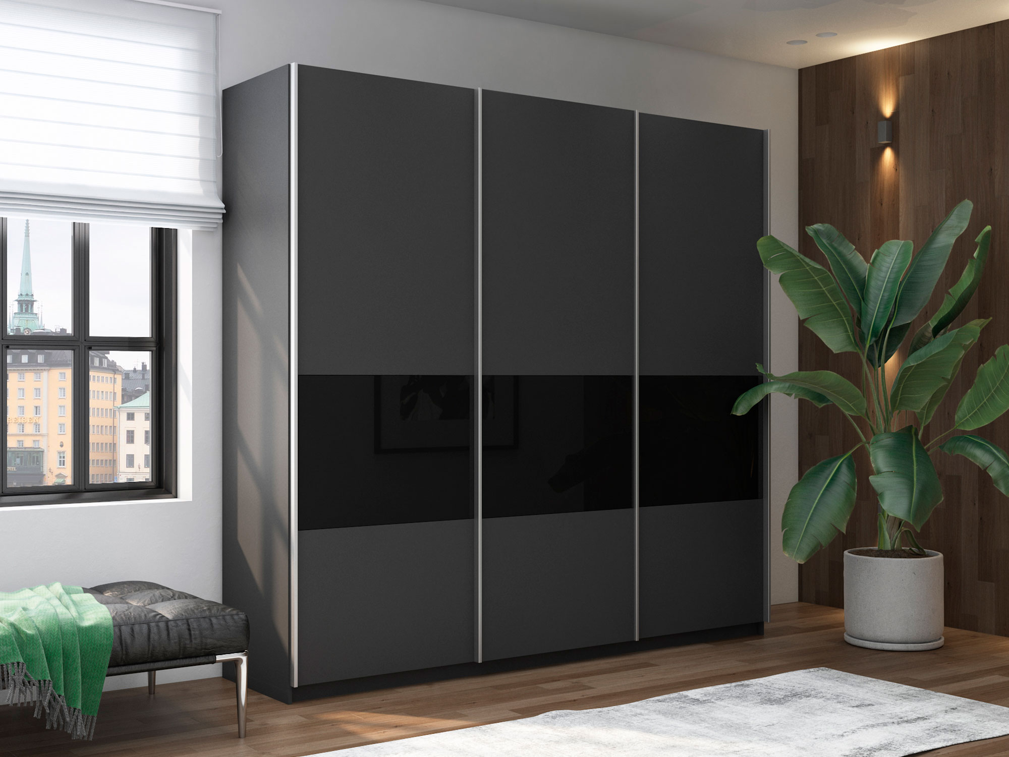 Шкаф-купе Прайм Широкий 3-х дверный ДСП/вставки Стекло Черное Серый Диамант