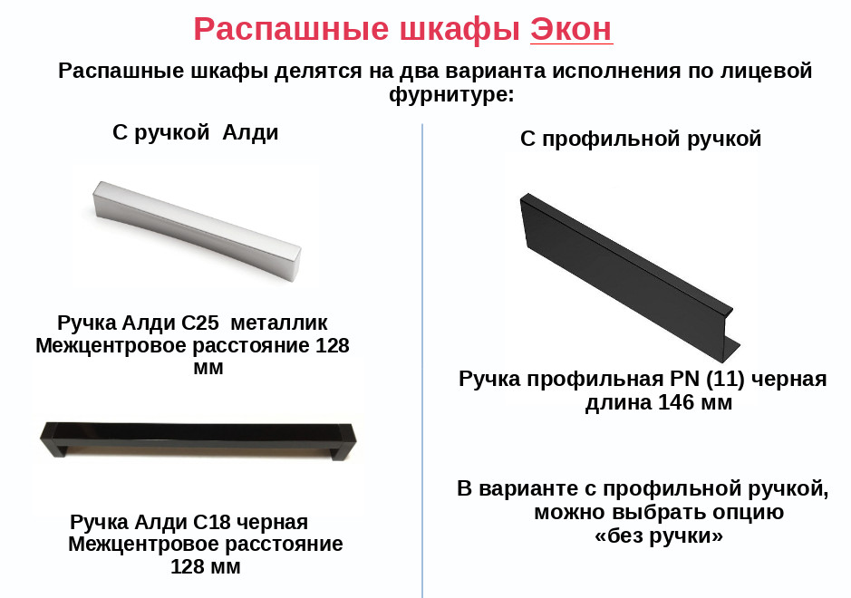 Распашные шкафы делятся на два варианта исполнения по лицевой фурнитуре: