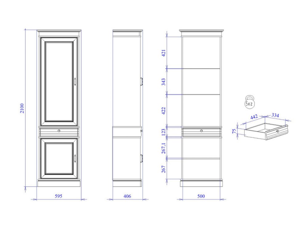 Пенал Сиена укомплектован выдвижным ящиком и полками (стекло и ЛДСП). Максимальная нагрузка на полку стекло - 5кг, ЛДСП - 15кг, на ящик 10кг.